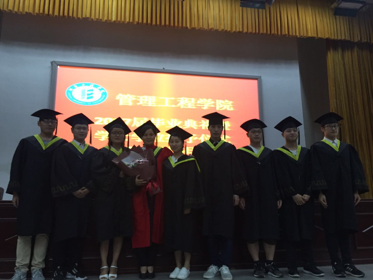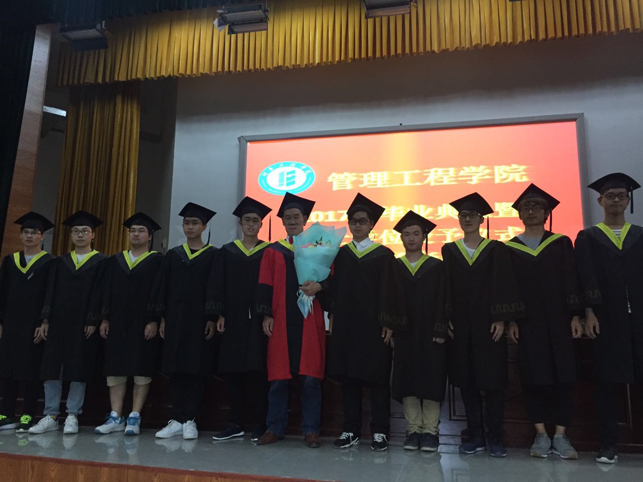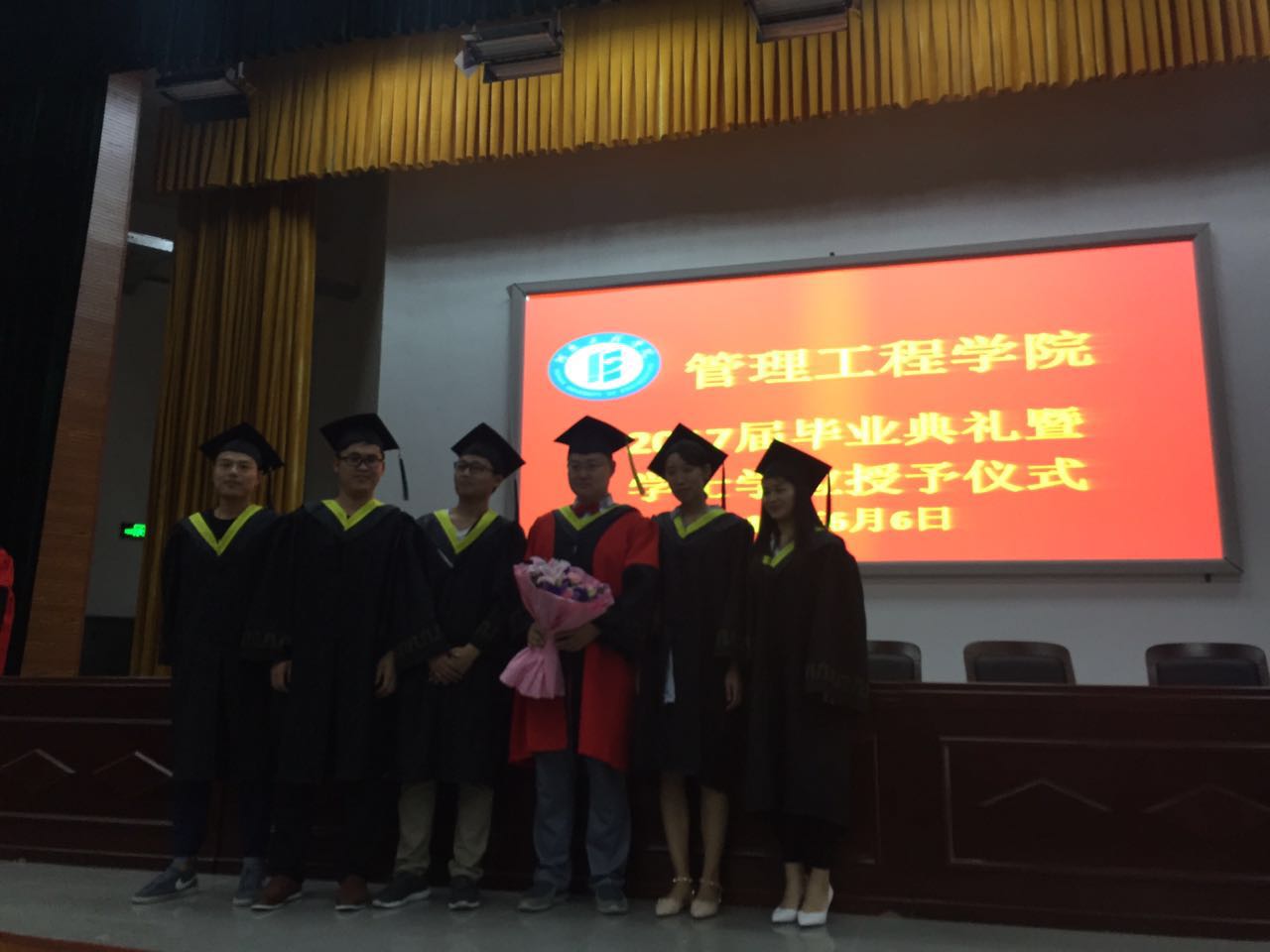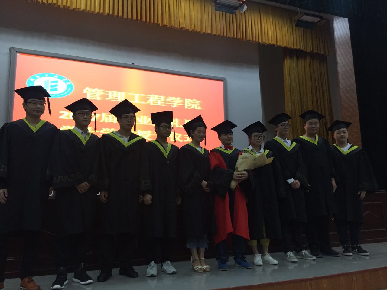 仪式在雄壮的国歌声中拉开了帷幕。院党总支谢国军书记代表学院党政致辞,表达了对本科毕业生衷心的祝愿和热切的祝福;随后,段文平院长宣读了关于授予2017届工业工程专业学士学位的决定的有关文件;副院长孙双全教授宣读了bet365官方贴吧省级,校级优秀毕业生,院级优秀本科毕业论文、院级优秀本科毕业论文指导教师的表彰决定;并宣读研究生名单。在场领导向省级、校级优秀毕业生代表、优秀本科毕业论文获得者、考取硕士研究生的同学、优秀本科毕业论文指导教师颁发证书及纪念品;工业工程1341王一丹同学代表全体毕业生发言,感谢母校、全体教师四年来的辛勤付出;回忆自己的大学生活,并对学弟学妹衷心祝愿。在校生代表工业工程1541曲艺同学祝全体毕业的学长学姐们前程似锦、生活幸福、工作顺利;教师代表高顺成教授代表全体教师向2017届毕业生表达了全体教师对全体毕业生最真实的祝福。接着由段文平教授向毕业生授予学士学位。衷心祝福bet365官方贴吧全体毕业生前程似锦,鹏程万里,共同创造出更加美好的明天!最后由毕业班班学生上台向导师献花合影留念,表达对老师的谢意,在毕业典礼尾声毕业生代表郑帅领带领全体毕业生宣誓,最后共同唱响毕业歌。